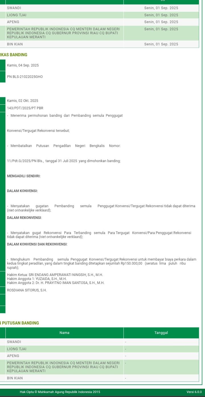 Pekanbaru – Sengketa lahan antara warga Selatpanjang, Swandi, dengan Pemkab Meranti dan sejumlah pihak yang diduga terlibat dalam praktik mafia tanah kini mencapai babak penting. Pengadilan Tinggi (PT) Pekanbaru melalui putusan nomor 143/PDT/2025/PT PBR tanggal 02 Oktober 2025 memutuskan untuk membatalkan seluruh putusan Pengadilan Negeri (PN) Bengkalis Nomor 11/Pdt.G/2025/PN BLS tertanggal 31 Juli 2025.