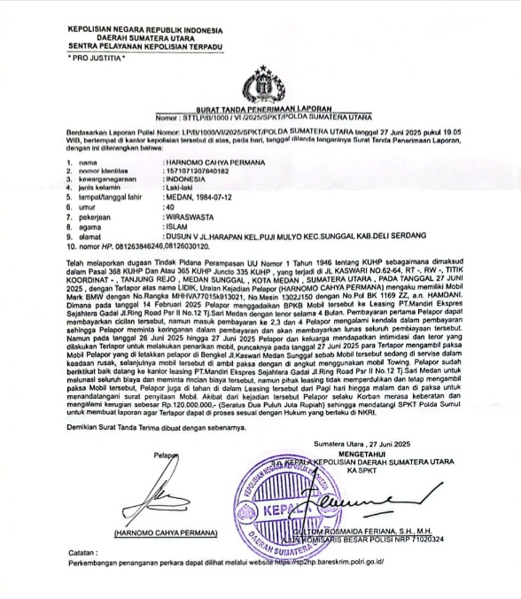 Medan, – Seorang warga Deli Serdang bernama Harmono Chaya Permana (HCP) telah melaporkan dugaan tindak pidana perampasan kendaraan bermotor 1 unit mobil ke Polda Sumatera Utara. Harmono Chaya merasa dirugikan terkait pengelolaan BPKB mobil miliknya yang dijaminkan kepada pihak leasing dari PT. MES GADAI, namun dirampas begitu saja dan diduga kuat adanya praktik penyalahgunaan transaksi gadai. (05/10)