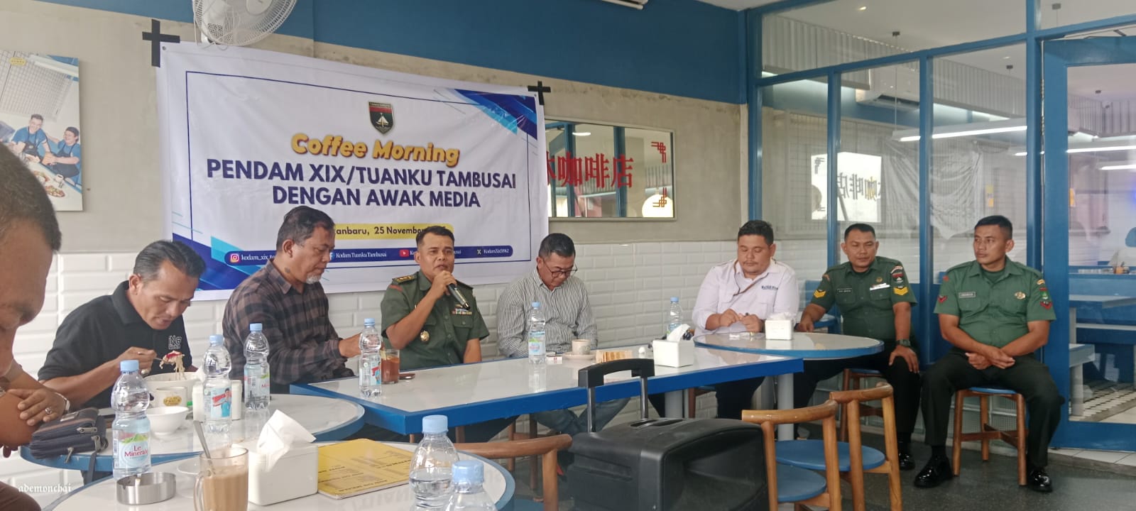 PEKANBARU – Pendam XIX/Tuanku Tambusai (TT) menggelar kegiatan Coffe Morning bersama insan pers di Provinsi Riau sebagai ajang silaturahmi dan memperkuat sinergitas antara TNI dan media. Suasana kegiatan berlangsung hangat, penuh keakraban, dan diwarnai interaksi santai yang mencairkan suasana. (25/11)