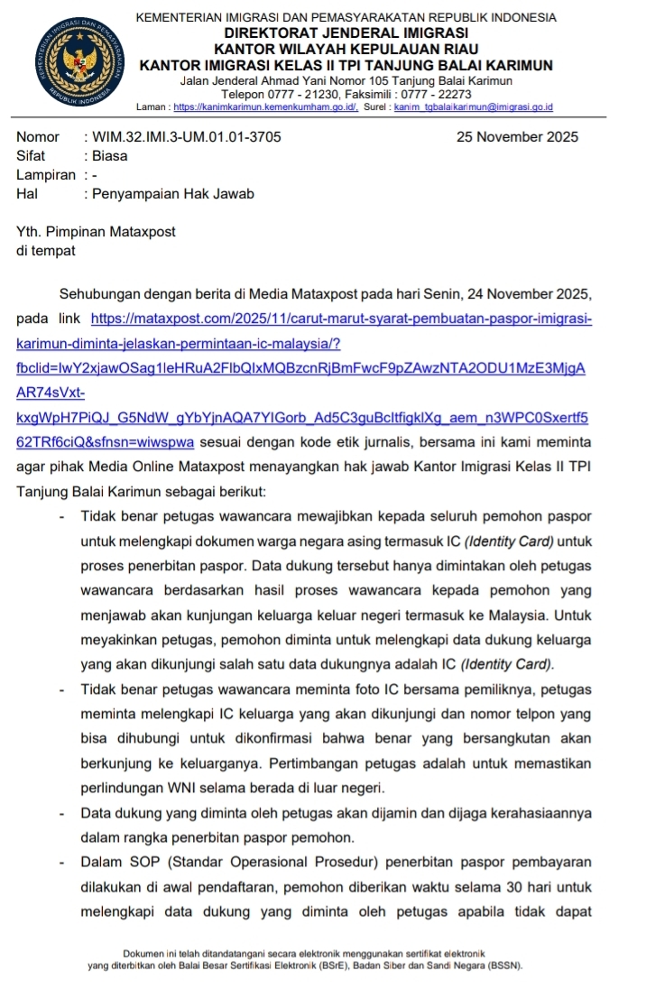 Mataxpost | Tanjung Balai Karimun ,- Kantor Imigrasi Kelas II TPI Tanjung Balai Karimun melayangkan hak jawab resmi atas pemberitaan Mataxpost bertanggal 24 November 2025 terkait dugaan kebijakan permintaan data warga negara Malaysia dalam proses penerbitan paspor WNI. (26/11)