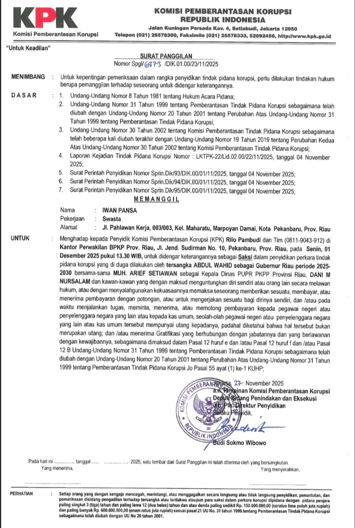 Dalam surat itu, I.P. diwajibkan hadir pada Senin, 1 Desember 2025 pukul 13.30 WIB di Kantor Perwakilan BPKP Provinsi Riau, Pekanbaru, untuk memberikan keterangan kepada penyidik KPK.