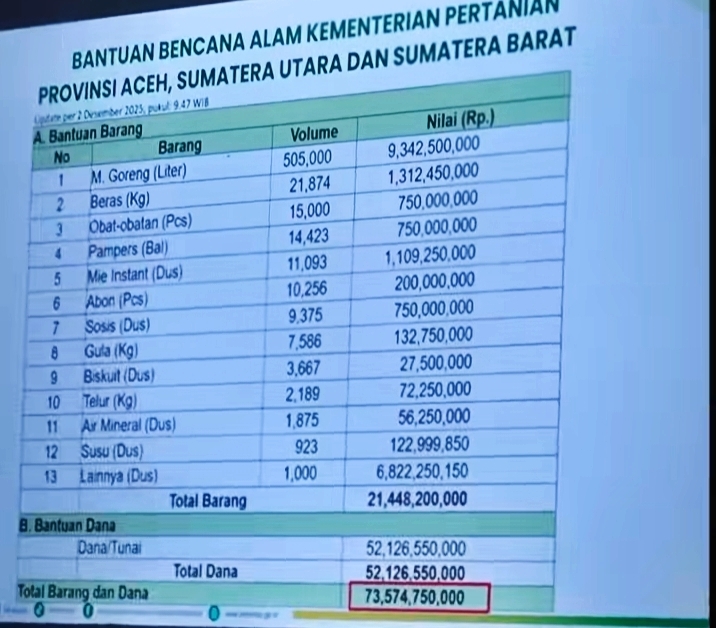 Mataxpost | Pekanbaru,- Publik dibuat terkejut setelah beredarnya dokumen anggaran bantuan bencana alam milik Kementerian Pertanian yang menunjukkan total nilai bantuan mencapai Rp 73.574.750.000. Dokumen tersebut memuat daftar barang dan dana tunai yang diklaim disalurkan ke wilayah terdampak bencana di Aceh, Sumatera Utara, dan Sumatera Barat. (08/12)