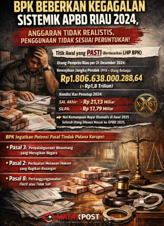 Mataxpost | Pekanbaru,- Berdasarkan Laporan Hasil Pemeriksaan BPK RI Perwakilan Provinsi Riau atas Laporan Keuangan Pemerintah Provinsi Riau Tahun Anggaran 2024, kegagalan pengelolaan APBD yang berujung pada opini Wajar Dengan Pengecualian serta munculnya kewajiban jangka pendek sebesar Rp1.806.638.000.288,64 tidak dapat dipahami sebagai kesalahan teknis satuan kerja semata. (28/12)