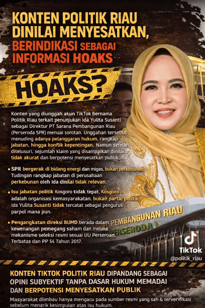 Mataxpost | Pekanbaru,- Konten yang diunggah akun TikTok Politik Riau terkait penunjukan Ida Yulita Susanti sebagai Direktur PT Sarana Pembangunan Riau (Perseroda SPR) menuai sorotan karena berisi sejumlah tudingan yang dinilai tidak akurat dan berpotensi menyesatkan publik.(29/12)
