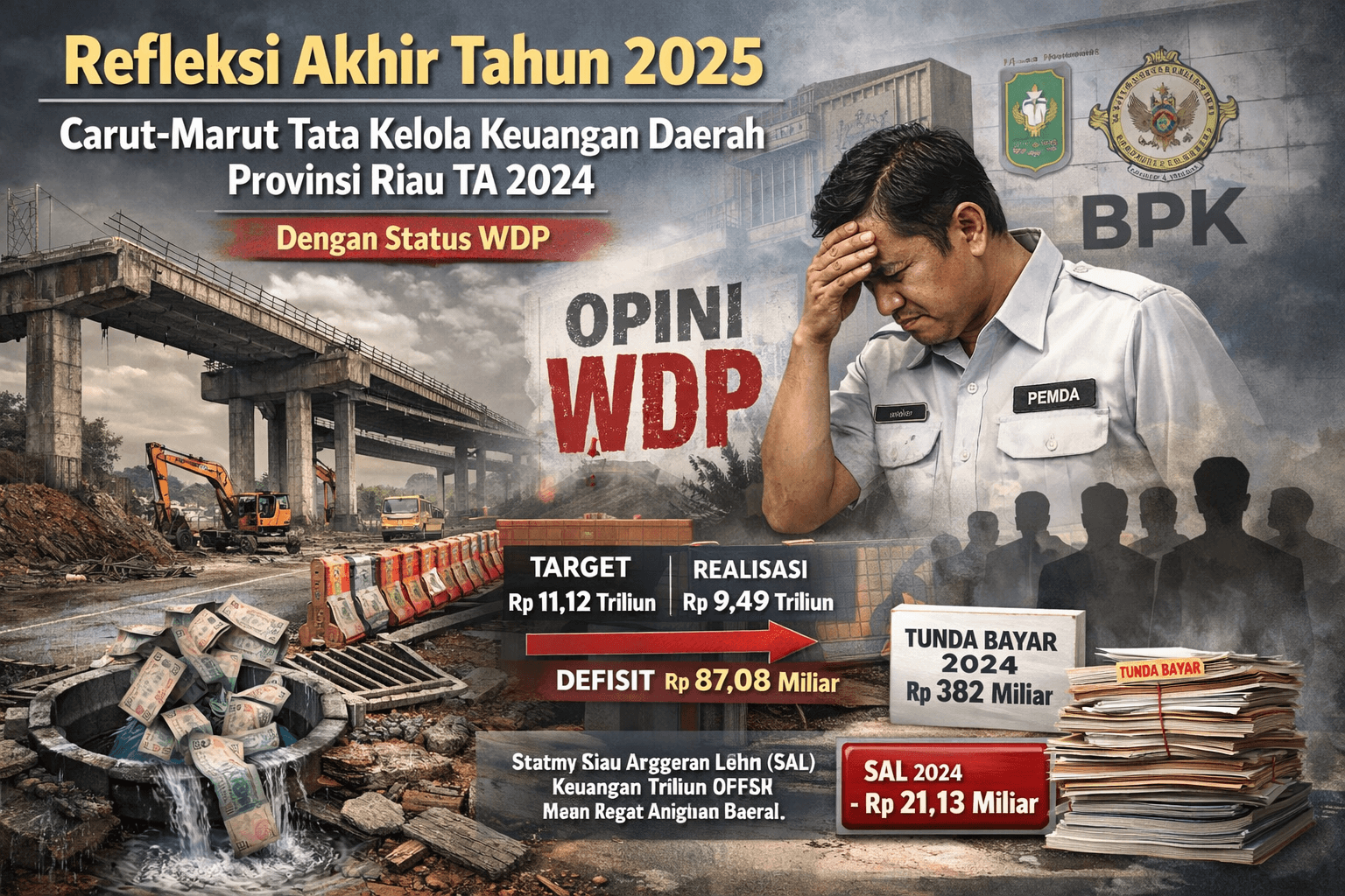 Jika dirangkai utuh, gambarannya jelas: target pendapatan 2024 gagal tercapai, belanja infrastruktur tidak selesai, proyek mangkrak tanpa kejelasan penegakan hukum, tunda bayar menumpuk, dan pada akhirnya APBD 2025 dibebani defisit besar hingga harus mengorbankan kesejahteraan pegawai.