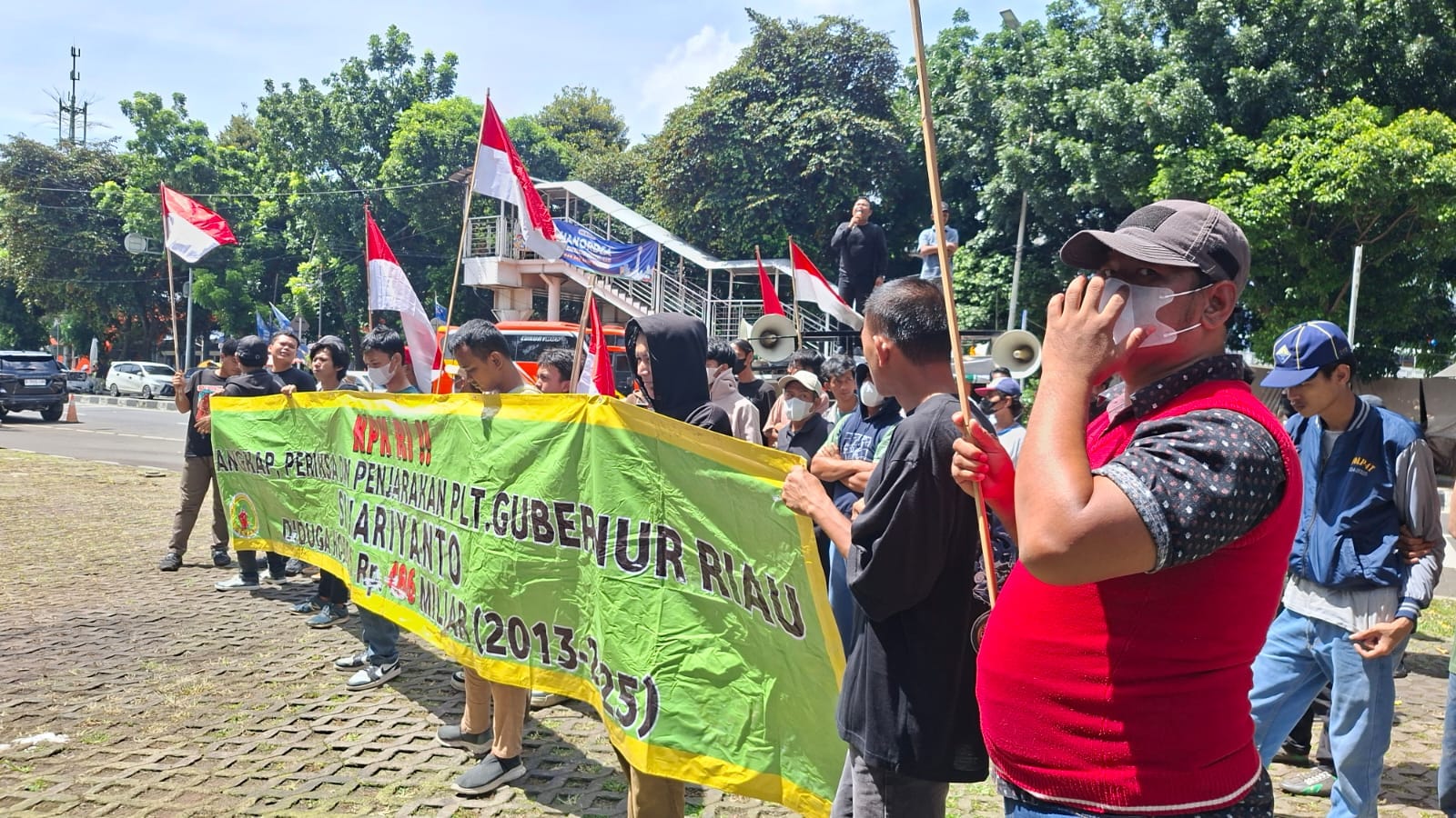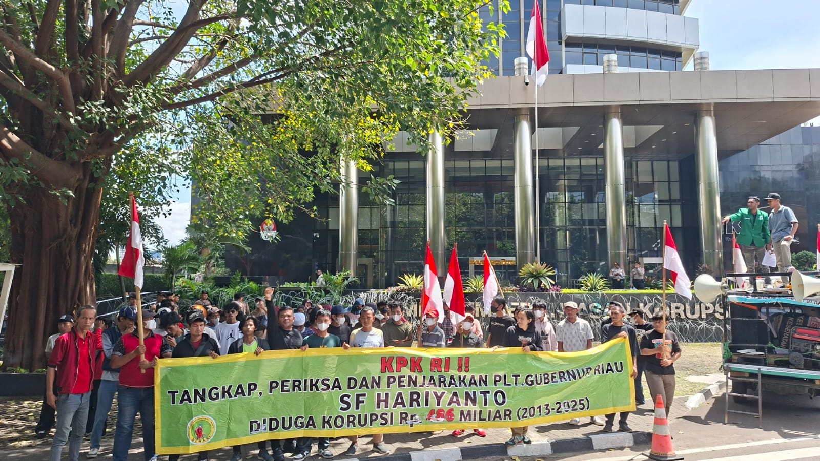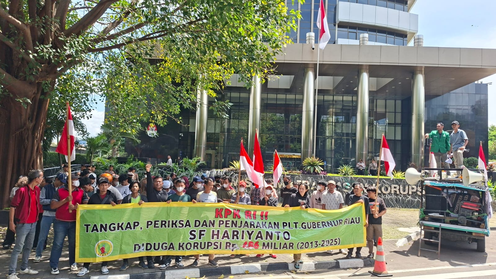 Mataxpost | JAKARTA β Gedung Merah Putih Komisi Pemberantasan Korupsi (KPK) dikepung massa Gerakan Mahasiswa Riau Jakarta (GEMARI Jakarta). Mereka mendesak KPK segera menangkap Pelaksana Tugas Gubernur Riau, SF Hariyanto, menyusul penggeledahan yang berujung pada penyitaan uang rupiah, valuta asing (dolar), serta sejumlah dokumen penting. (09/01)