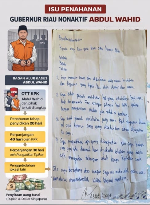Mataxpost | Pekanbaru,- Sebuah surat tulisan tangan berisi sumpah dan klarifikasi yang disebut dibuat oleh Gubernur Riau nonaktif Abdul Wahid beredar luas di tengah proses hukum yang menjeratnya di Komisi Pemberantasan Korupsi (KPK). (12/01)