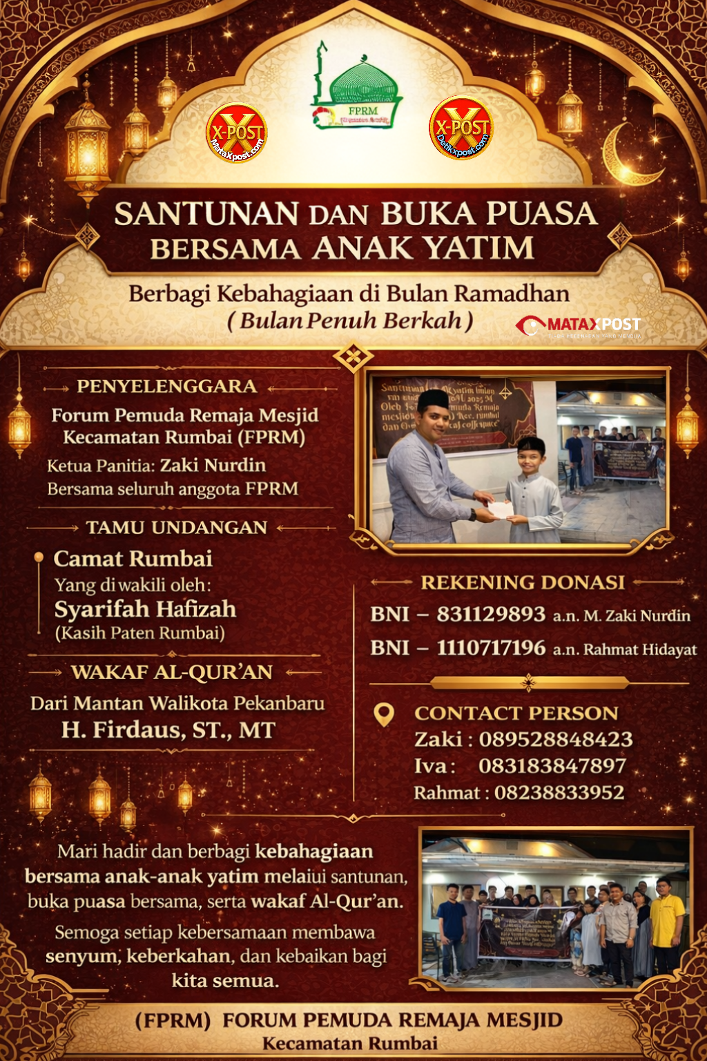 Mataxpost | Rumbai β Forum Pemuda Remaja Mesjid Kecamatan Rumbai (FPRM) sukses menyelenggarakan kegiatan Santunan dan Buka Puasa Bersama Anak Yatim pada Sabtu, 7 Maret 2026 di Decaf Coffenspace Rumbai.(08/03)