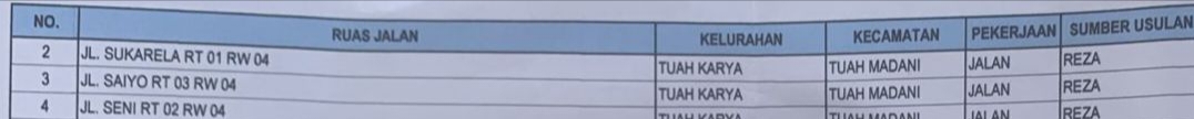 Dokumen daftar pekerjaan jalan di Pekanbaru, tepatnya di Kelurahan Tuah Karya, Kecamatan Tuah Madani, menunjukkan fakta mencolok. Pada kolom βSumber Usulanβ, seluruh item kegiatan secara konsisten mencantumkan nama βREZAβ. Tidak ada variasi sumber lain dalam daftar tersebut.
