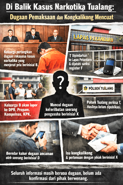 Mataxpost | Siak, – Polemik dugaan rekayasa dalam penanganan perkara narkotika yang menjerat seorang pria berinisial B di Tualang menjadi sorotan publik. Pihak keluarga menilai terdapat sejumlah kejanggalan dalam proses hukum yang berjalan, termasuk dugaan tidak dilakukannya Asesment TAT secara memadai, hingga munculnya indikasi pemaksaan konstruksi perkara sampai ke tahap persidangan. (11/04)