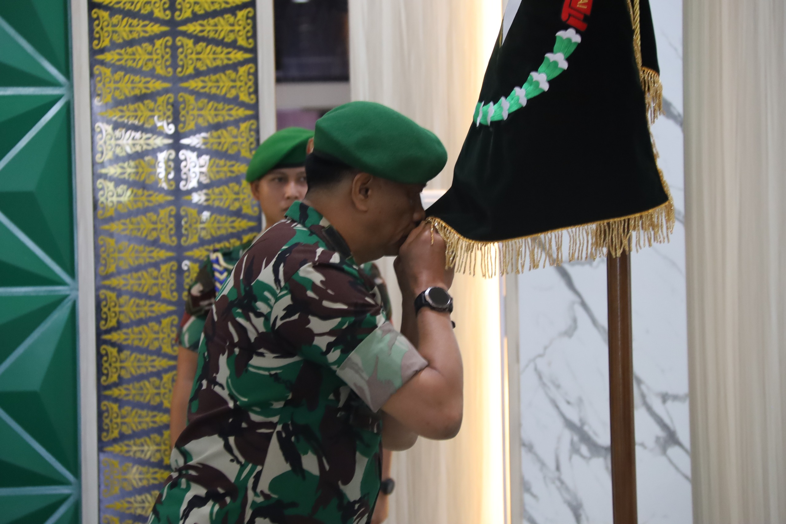 Prosesi berlangsung tertib dan khidmat, diawali dengan pembacaan surat keputusan, dilanjutkan tradisi satuan melalui penciuman Pataka Kodam XIX/TT sebagai simbol kehormatan dan kecintaan terakhir kepada satuan.