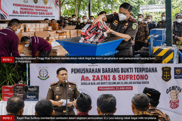 Mataxpost | Pekanbaru, โ Kejaksaan Tinggi Riau memusnahkan 22.298.200 batang rokok ilegal yang merupakan barang rampasan negara dari perkara atas nama Sufriono dan Zaini. Kegiatan ini dipimpin langsung Kepala Kejati Riau, Sutikno, sebagai pelaksanaan putusan pengadilan yang telah berkekuatan hukum tetap (inkrah). (23/04)