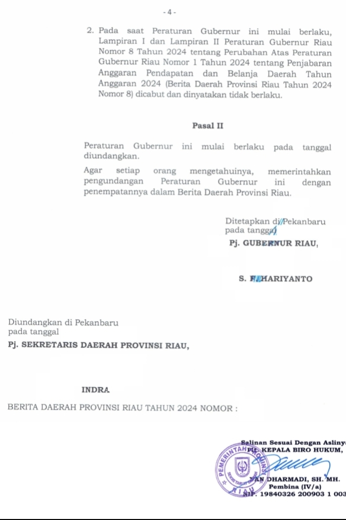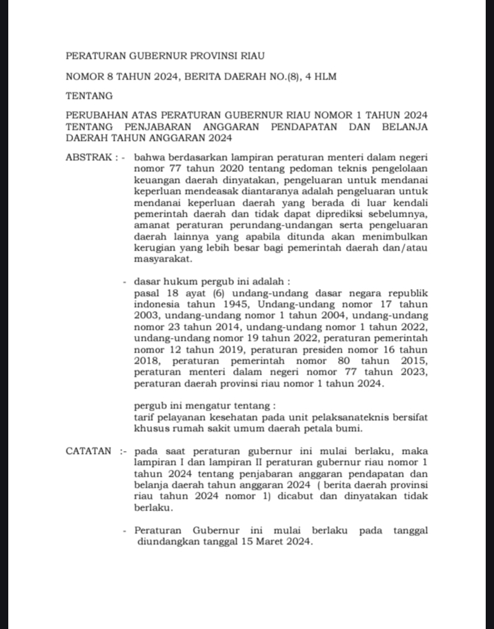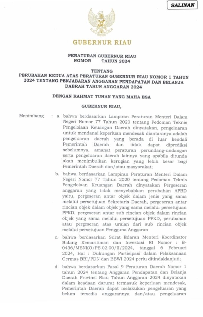 Berikut adalah daftar Pergub yang mengatur perubahan APBD Riau 2024: